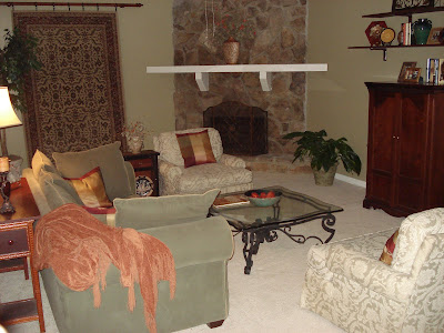 I am very fortunate to have a really large living room. Again, I have great windows. So much so, that the Roman shades are rarely let down. There's no doubt that the fireplace is the greatest feature of the room, and I love the floor to ceiling stone. Its position in the corner makes it even more unique.